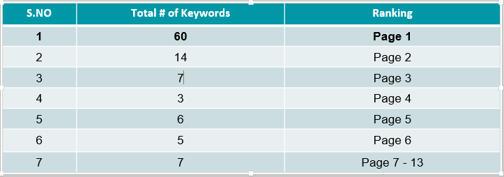 - Solid Visibility Across Top Pages:14 keywords are placed on Page 2, indicating strong potential to move to Page 1 with continued SEO efforts. 7 keywords ranking on Page 3, showing improving authority and keyword stability.