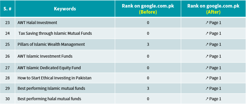 To establish AWT Investments as a top-ranking authority in the Pakistani financial services sector by improving organic visibility, enhancing keyword performance, and driving qualified traffic through targeted content and technical SEO improvements.